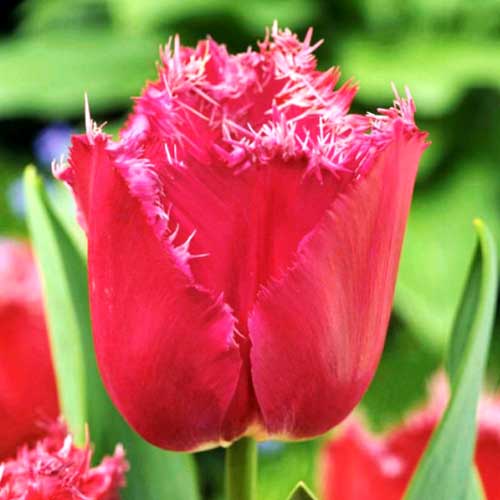 Тюльпан бахромчастий Мустанг – це незвичайний сорт з бахромою на кінцях пелюсток, яка нагадує невеликі голочки, вкриті інеєм. Квітка особливо чудово виглядає у напіврозпуску. Висота рослини з квітконосом коливається в межах 30-40 см. Бутони великі, ошатні, яскраво-червоного кольору.