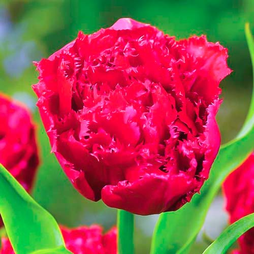 Тюльпан бахромчастий Ліон Кінг – дивовижна квітка, яка не особливо схожа на звичні для нас сорти через велику кількість пелюсток. Їх кармінно-червоні краї прикрашені бахромою, яка нагадує тонкі голочки інею химерного кольору. Розпускається квітка в травні, довжина келиха досягає 7-8 см, а його діаметр – 9-15 см. Міцні півметрові стебла не гнуться під вагою бутонів.