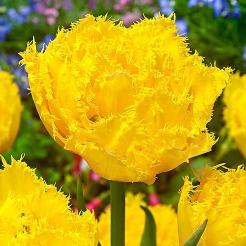 Тюльпан бахромчастий Екзотик Сан - цей сорт тюльпана справжня екзотика. Махрові пелюстки яскраво-канаркового кольору прикрашені дрібною бахромою, яка проходить по краю. Дуже ніжно й ефектно виглядає. Келих квітки вирізняється великими розмірами, міцне стебло здатне утримати яскраву пишність під час цвітіння.