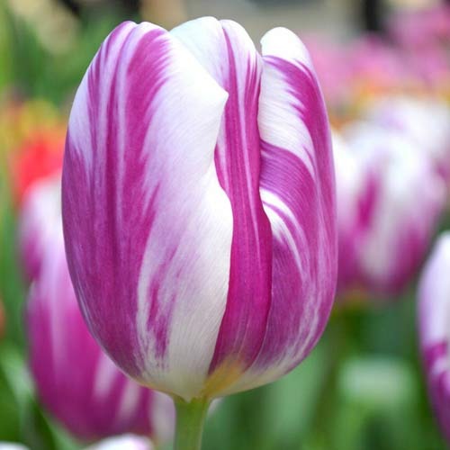 Тюльпан Flaming Flag належить до великої групи тюльпанів Triumph, які відрізняються міцними стеблами з класичною формою суцвіть. Кольори пелюсток білі та фіолетові, які перекривають один одного у вигляді смуг і плям на їхній поверхні. Великі квіткові чашечки, завдовжки 8 см і завширшки 12 см, розкриваються наприкінці квітня-початку травня і зберігаються до 2-3 тижнів. Чудово підійде для зрізаної квітки у вазі або весняних композицій. Для кращого ефекту рекомендується висаджувати не менше 10-15 рослин на одному місці.
