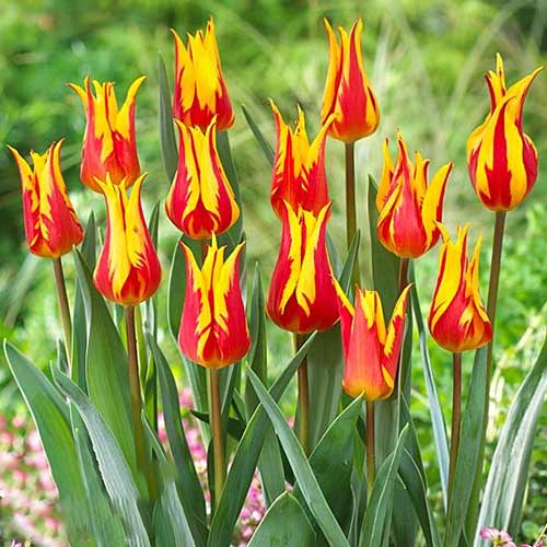 Тюльпан лілієвидний Байсайд Флейм – ніжна елегантна квітка із загостреними вгорі пелюстками, яка ідеально підходить для оформлення садових клумб та вигонки. Її також можна вирощувати для складання живих букетів. Основне забарвлення пелюсток – жовте, але на тлі іще хаотично розкидані червоні полум'янисті язики. Висота – від 50 до 60 см.