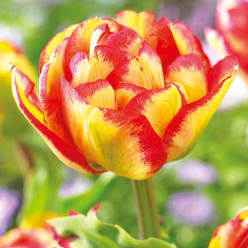 Тюльпан махровий Сандаунер – махрова квітка, за формою схожа на лотос. Оригінальні бутони настільки пишні та ефектні, що на них можна дивитися годинами. Сорт рідко виростає понад 35 см заввишки, тому його легко вигнати у зимовий час, посадивши в горщик або контейнер. Яскраві пелюстки забарвлені в складні поєднання з жовтого і червоного тонів.