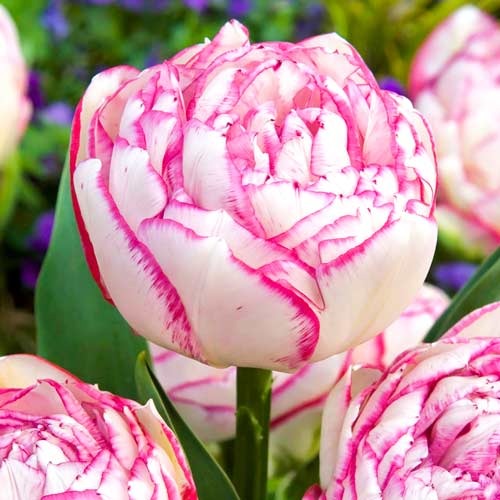Квітучі тюльпани Дабл Тач схожі на махрові білі півонії з контрастною малиновою облямівкою по краю кожної пелюстки - надзвичайно ефектний густомахровий сорт.