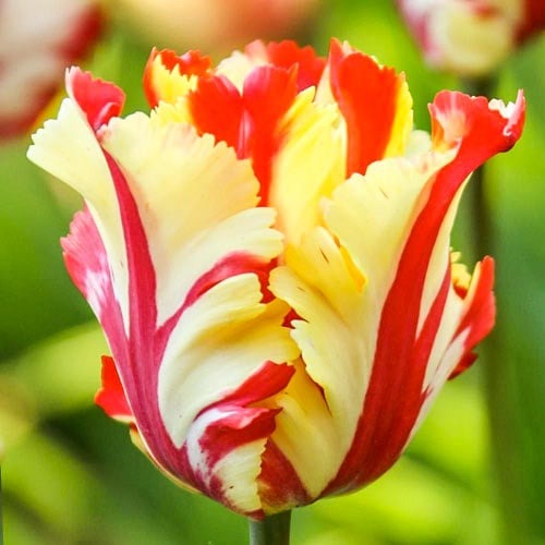 Тюльпан папуговий Флеймінг Перрот здатний створити на садовій ділянці справжнє буйство фарб. Розташований на високому стеблі сильно гофрований келих поєднує білий і ніжно-кремовий кольори (сортовими ознаками допускаються лимонні відтінки) в комбінації з широкими червоними мазками, що нагадують забарвлення крил фламінго. Висота келиха становить 8-10 см. Діаметр розкритої чаші - 15-20 см. До кінця сезону цвітіння кремовий відтінок пелюсток змінюється молочно-білим.