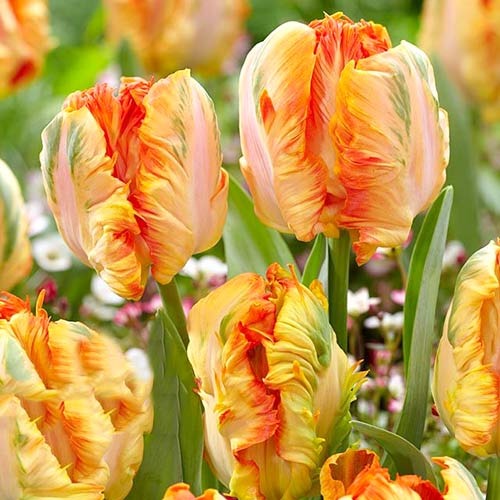 Тюльпан Parrot King - справжня зірка в нашому саду. Ця цибулинна рослина вражає садівників великими чашечками на стеблах, що досягають 40-45 см. Пелюстки тюльпанів набувають кольору від помаранчевого до червоного з легкими вкрапленнями зеленого, утворюючи компактні щільні суцвіття.
