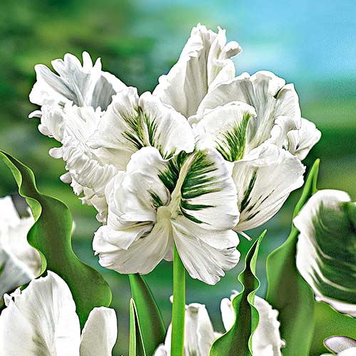 Тюльпан папуговий Уайт Перрот (Tulips White Parrot) – цибулинна квітка із сніжно-білими бутонами, зовнішня сторона яких прикрашена тонкою памороззю смужок. Візерунок нагадує малесенькі гілочки фантастичної хвойної рослини. Але це ще не вся краса папугової квітки – її пелюстки незвичайної форми, гофровані і глибоко порізані, дійсно нагадують крила однойменного птаха. Розташувати їх можна уздовж садових доріжок або у центрі клумби в оточенні ніжних пролісок.