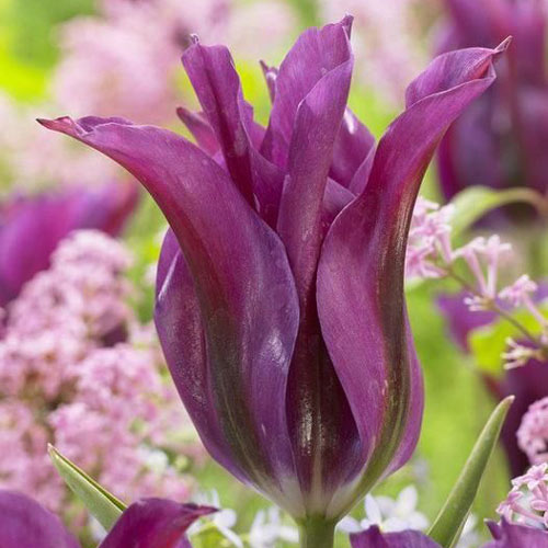 Тюльпан Пурпл Дол – лілієквітковий, а це значить, що його бутон розкритий не повністю: розходяться лише оксамитові кінці квітки. Глибокий фіолетовий колір і витончена форма точно звернуть увагу на себе серед великої кількості висаджених рослин. Височить лялькова квітка на рівні 45 см над землею. Замовте ніжний тюльпан Пурпл Дол, який порадує своїм цвітінням в середині-наприкінці весни.