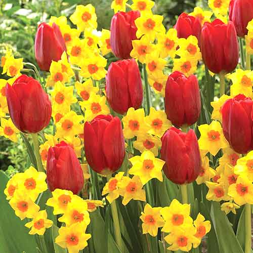 Комплект тюльпанів і нарцисів Сонячна долина (Tulipa Renegade/Falconet) – чудовий мікс із двох видів культур. Він був підібраний професійними флористами, тому гармонійно виглядаэ на будь-якій клумбі та квітнику. Набір складається із червоних тюльпанів та сонячно-жовтих нарцисів із помаранчевими коронками. Всі квіти приблизно однакові за висотою – 35-40 см, а завдяки різній формі бутонів та забарвленню пелюсток вони будуть тільки підкреслювати красу сусіда.
