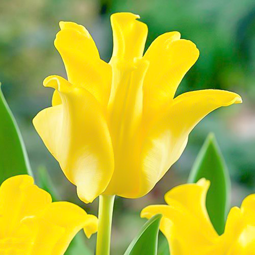 Тюльпан Єллоу Кроун (Tulips Yellow Crown) – це цибулинна квітка, яка просто виходить за рамки звичного сприйняття, а все завдяки дуже незвичайній формі бокалів. Неймовірно вигнуті пелюстки роблять бутони схожими на птахів, а яскраво-жовтий колір додатково підкреслює «однаковість». Великі квітки висотою 10 см зберігають форму увесь період цвітіння, а міцні стебла висотою близько 50 см дозволяють їм гордо триматися у будь-якій квітковій композиції.