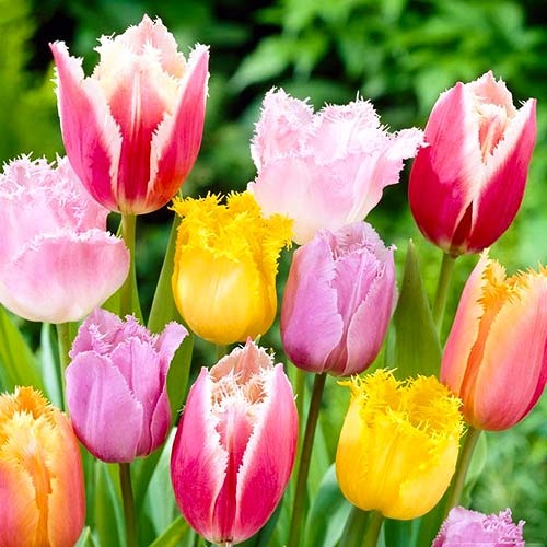 Тюльпани бахромчасті, мікс - містить надзвичайно барвисту суміш високих ефектних тюльпанів з торочкуватими пелюстками. Ви знайдете тут сорти з яскравими, білими і жовтими квітами, а також з рожевими, червоними або дуже темно-бордовими відтінками. Тюльпани якнайкраще прикрашають клумби в саду, але вони також можуть прикрасити клумби, або місця на газонах. Їхні високі та жорсткі стебла можна з успіхом зрізати і складати з них красиві та міцні букети.