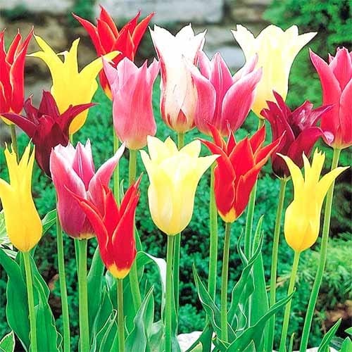 Тюльпани лилієподібні, мікс - це група тюльпанів, що характеризуються вигнутими подовженими пелюстками бутона, завдяки чому вони нагадують квітки лілії. Ці тюльпани мають багаторічну традицію і безліч шанувальників. Тюльпани з цієї групи слід садити в затишних місцях під деревами і чагарниками, також вони мають чудовий вигляд у компанії декоративних трав.