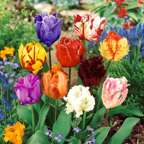 Тюльпани Перрот анітрохи не поступаються за яскравістю забарвлення своїм пернатим прототипам – папугам. Витончений, трохи порізаний край за зовнішнім виглядом схожий на крило птаха. Купіть і посадіть на своїй ділянці таких «пташок», і гарний настрій вам гарантовано. Довжина квітки досягає 45 см, а діаметр розкритого келиха – 10-15 см. Ми пропонуємо сформувати яскраву клумбу з суміші забарвлень папугових тюльпанів або посадити їх у кашпо на балконі.