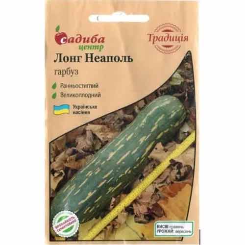 Гарбуз Лонг Неаполь – ранньостиглий плетистий сорт, на якому формуються плоди до 80 см завдовжки. Їх маса сягає 20-35 кг. Кора тверда, темно-зелена із помаранчевими смугами. М'якоть щільна, яскраво-апельсинова, насіннєва камера маленька, розташована в кінці плоду. Хазяйки цінують сорт за великоплідність та приємний смак, а також за тривале зберігання.