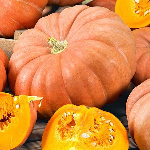 Гарбуз Паризький золотий – це сорт раннього дозрівання. Перший урожай ви зберете через 100-115 днів. Плоди мають плоскоокруглу форму з сегментованою поверхнею теплого оранжевого кольору. М'якоть яскравого золотавого кольору, на смак дуже ніжна і соковита, не дуже солодка. Шкірка щільна, але не товста. Маса плодів – 4-9 кг.