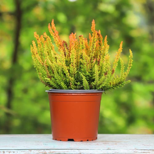 Вереск звичайний Зое — яскравий сонячний чагарник, що змінює свій колір. Влітку листочки золотисто-жовтого відтінку, а до зими стають теплого насиченого помаранчевого кольору, створюючи неймовірний контраст із білим снігом. Ефектна прикраса для вашого саду, чудово підходить для оформлення бордюрів та альпінаріїв.