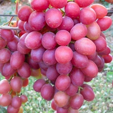 Виноград Анюта - середньостиглий сорт винограду. Період дозрівання 130 - 140 днів. На півдні України ягоди достигають у другій декаді вересня. Ягоди фарбуються рівномірно в ніжно-рожевий відтінок, іноді набувають більш темний колір. Урожай може довгий час залишатися на кущах і при цьому не втрачати смакових і товарних якостей. Грона великі, середня вага від 700 до 1500 г. Виноград частіше конічної форми, має середню щільність. При правильному формуванні куща, грона може досягати 2 кг. Ягода велика, овальна з ніжним мускатним присмаком. Використовують для вживання в свіжому вигляді, підходить для соків, морсів і компотів. У нашому інтернет-магазині тільки сучасні сорти і гібриди.
