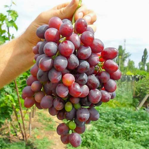 Виноград Краса Нікополя - столовий сорт, сверхраннього терміну дозрівання. Вегетаційний період від 105 до 115 днів. Ягоди овальної форми, в середньому маса становить 4-5 г, темно-рожеві, при перезріванні майже фіолетові. М'якоть щільна, шкірка тонка. Смак приємний, гармонійний. Грона середньої щільності або пухка, конічна, середньою масою 400 - 600 г. При дозріванні забарвлюється рівномірно, має відмінний товарний вигляд. Використовують в свіжому вигляді, підходить для приготування вин, соків, морсів і компотів. Ви можете замовити в нашому інтернет-магазині саджанці винограду без передоплати.