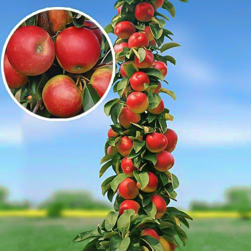 Це сорт, на карликовій підщепі, призначений для вирощування на невеликих і вузьких площах, але з багатою продуктивністю. Вільно зростаюче вертикальне дерево має потужний стовбур, який може досягати висоти близько 2,5 м. Стовбур є основною опорою для плодів, у цього сорту немає гілок, тільки кілька шпор. Плоди великі, круглі, злегка приплюснуті, їхній колір - суміш червоного і жовтого. М'якоть у них м'ясиста, дуже соковита, з кисло-солодким смаком.