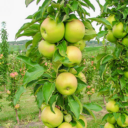 Яблуня колоновидна Каскад – зимовий самоплідний напівкарликовий сорт з дуже високою морозостійкістю. Яблука округлі, зі світло-зеленою шкіркою і вираженим рум'янцем. М'якуш білий, щільний, соковитий, з приємною кислинкою. Врожайність дорослих яблунь – до 50 кг з одного дерева. Щільність посадки – 4 дерева на 1 м². Плодоношення триває 10-12 років.