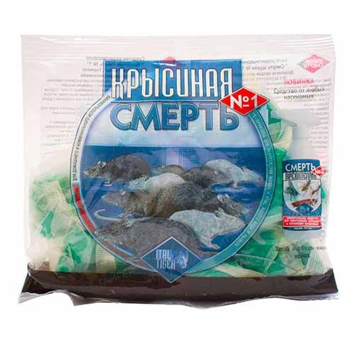 Засіб для захисту від побутових шкідників Крисина смерть № 1 - родентицидний засіб, отрута-приманка для знищення мишей та щурів будь-якого виду та розміру, для домашнього та комунального використання. Тістоподібна маса темно-синього або червоного кольору у фільтр-пакетиках, для боротьби з сірими та чорними пацюками та будинковими мишами.
