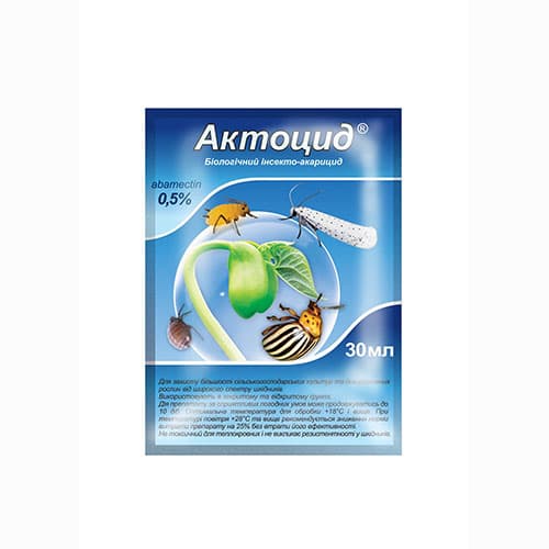 Актоцид - це натуральний, чистий, біологічний препарат, який має системно-контактну дію. Він бореться з такими шкідниками як: довгоносики; совки; попелиці; пильщики; плодожерка; павутинний кліщ; рослинні кліщі; квіткоїди. Біопрепарат використовують для захисту декоративних і сільськогосподарських культур від шкідників. Свою перевагу він отримав завдяки природному походженню та використанню у своєму складі активних мікроорганізмів, які пригнічують розвиток як захворювань, так і шкідливих комах.